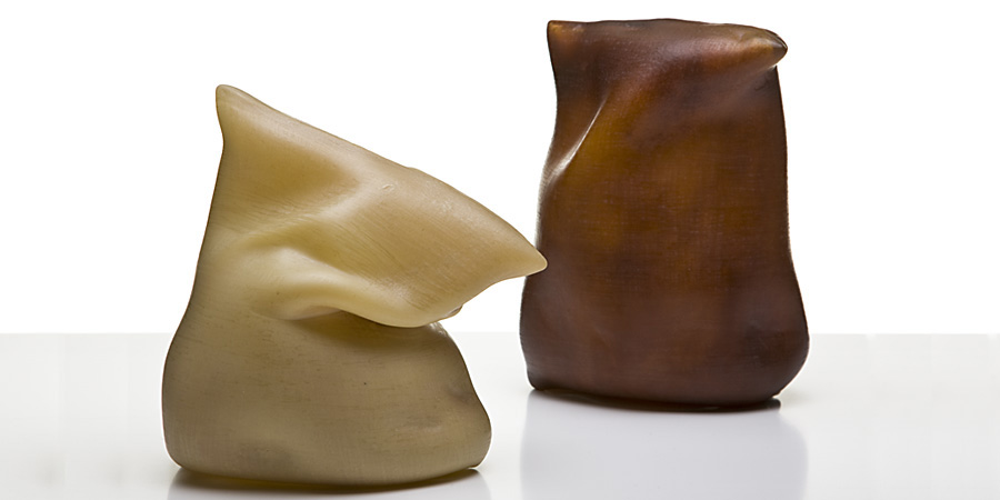 < Beige and Amber Being Bags 2010 Blown, sandblasted and wheel polished (Left) 17cm x 24cm x 14 cm (Right) 18cm x 26cm x 15cm